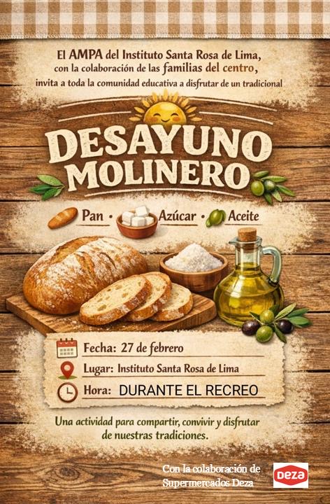 🏆🔥🥖🫒🍞 Desayuno Molinero organizado por el AMPA Durante el recreo disfrutaremos de nuestro tradicional desayuno andaluz con pan, aceite y azúcar. ¡Un momento perfecto para compartir y celebrar nuestras raíces! 🌞 ¡Te esperamos! 💚✨ No#DíaDeAndalucía #IESantaRosadeLima #Carnaval #ConcursoDeDisfraces #DesayunoMolinero #AMPA #CórdobaCF #Tradiciones #ComunidadEducativa #27DeFebrero 💚🤍