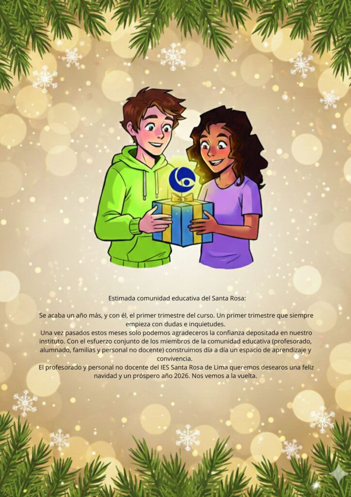 El profesorado y personal no docente del IES Santa Rosa de Lima queremos desearos una feliz navidad y un próspero año 2026. Nos vemos a la vuelta.